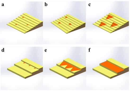 Based on the above-mentioned results, we proposed the following mechanism for the growth of MoS2 on the LSS and HSS. Firstly, due to the lower nucleation energy at the step edge and the design of the step direction, highly oriented crystals are formed at the step edge on both substrates, as shown in Figure 5a,d. With an increasing deposition time, the grains continue to grow. Since the energy required to cross the step on the surface of the LSS is relatively low, the sample exhibits cross-step growth (Figure 5b,c). However, the energy required for crossing the step is too high on the HSS. Hence, as shown in Figure 5e, the crystals nucleating at the same step edge cannot cross the step (i.e., grow within the step surface). Eventually, it forms nanoribbons in the same direction as the step (Figure 5f).