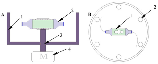 Schematic diagram of centrifugal spinning equipment: (A) front view: 1, protection cover; 2, nozzle; 3, transmission device; 4, motor; and (B) top view: 1, container; 2, fiber collection rod.