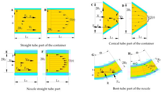 To simplify the model, the container and nozzles are facilitated to a two-dimensional plane figure as shown in Figure 2A. It can be clearly seen from Figure 2A that the container part in the figure is left- and right-symmetrical except for the nozzle. The bending direction of the bent-tube nozzle part is just opposite, and the nozzle size is completely consistent. For design purposes, the right half of Figure 2A is taken to develop the motion model, as shown in Figure 2B.
