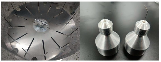 Centrifugal spinning experiments were carried out to verify the accuracy of the optimization results. There are many polymer compounds that can be applied to the preparation of nanofibers by centrifugal spinning—for example, polyethylene oxide (PEO), average molecular weight: 1 × 106, completely soluble in water. PEO exhibits excellent properties such as being non-toxic and non-irritating, and having a low solution rheology, combined action with organic solvents, low ash content, and good thermoplasticity. It is widely used in construction cement mortar, cosmetics, agriculture, food, petroleum, pulp and paper, and other fields. Polyvinyl alcohol (PVA) resin aqueous solution has good film-forming and emulsifying properties. It can be used as a protective colloid during the emulsification and suspension polymerization of polymers. PVA can be used in textile slurry, Vinnie fiber, paper coating agent, building material, adhesive, PVA film, food, and medicine. PVA can also be used as a soil conditioner, polymerization suspension agent, emulsifier, quenching agent, and so on. In addition, with the continuous development and improvement of PVA performance, its use is constantly expanding. Homemade centrifugal spinning equipment and two kinds of nozzles were used in this experiment. The equipment is shown in Figure 7. Centrifugal spinning equipment is used to produce nanofibers.