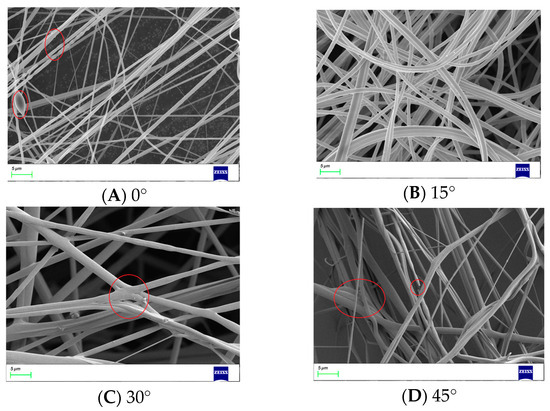 The quality of the nanofibers can be changed by varying the bending angle of the nozzles. In the centrifugal spinning process, when the bending angle is 0°, due to the presence of Coriolis force, the solution at the nozzle outlet will experience a shear phenomenon. In order to avoid this phenomenon, the nozzle is optimized to be curved. The SEM images of nanofibers produced by nozzles with different bending angles are shown in Figure 11.