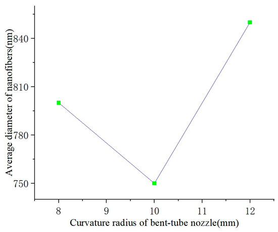 When the bending angle and nozzle diameter are determined, the curvature radius of the nozzle will only affect the distance traveled by the solution inside the nozzle. In other words, the curvature radius will affect the energy loss of the solution. The SEM images of nanofibers produced with different curvature radii are shown in Figure 12. The line graph of the average diameter of the nanofibers and the curvature radius of the bent-tube nozzle is shown in Figure 13.