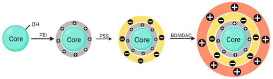 In order to develop antimicrobial particles, three distinct particle cores were functionalized to incorporate BDMDAC. Hydroxyapatite, calcium carbonate and glass beads were used as cores for a layer-by-layer approach (LbL), as schematized in Figure 1. LbL assembly is a safe, economic and environmentally friendly way to modify surfaces. This technique is based on noncovalent interactions, typically electrostatic ones [23]. Two distinct building blocks, oppositely charged, interact with each other through attractive interactions, forming a supramolecular multilayer of polyelectrolytes. Repulsive forces between building blocks of the same type will restrict the layer formed during a single adsorption step [30]. So, LbL consists in the deposition of polyelectrolytes with opposite charges from aqueous solutions, which will subsequently lead to the formation of multilayers.