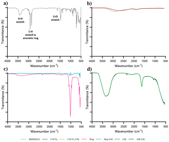 FTIR spectra of (a) BDMDAC (grey line); (b) CaCO3-calcium carbonate microparticles before (purple line) and after functionalization CaCO3-LbL (orange line); (c) Hap-hydroxyapatite before (pink line) and after functionalization. (d) Hap-LbL (blue line) and GB-glass beads before (green line) and after functionalization GB-LbL (black line).