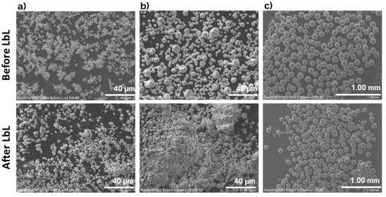 SEM analysis of microparticles before (upper line) and after (bottom line) layer-by-layer modification: (a) CaCO3 microparticles, (b) Hap microparticles, (c) glass beads (GBs).