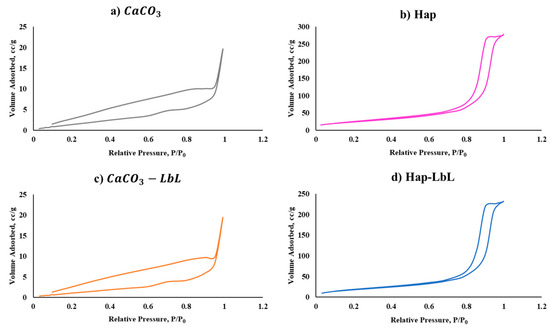Regarding the Hap microparticles, they have the same size as the CaCO3 microparticles; however, they are structurally different. Analyzing the isotherms obtained in Figure 4b,d, Hap microparticles showed a characteristic profile of isotherms type IV, usually exhibited by mesoporous solids with a cylindrical pore shape [36]. By observing pore size distribution (see data in Supplementary Material Figures S1–S4), it was possible to conclude that the pore sizes of Hap microparticles are not only meso but also macro pores.