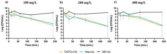 When analyzing the killing effect of Hap-LbL and CaCO3-LbL microparticles, it is observed that, after 240 min. of contact, both functionalized particles impose a 4 Log reduction for the three tested concentrations (orange and blue lines). The killing kinetics of both microparticles seem similar and concentration-independent. Note that, as we get closer to the limit of detection of cultivable cells, a high standard variation is seen and, in some of the experiments, no colonies were found at all. This only serves to illustrate the uncertainty associated to the lowest values of CFUs, which are close to the detection limit of the culture method and may possibly reach even lower levels.