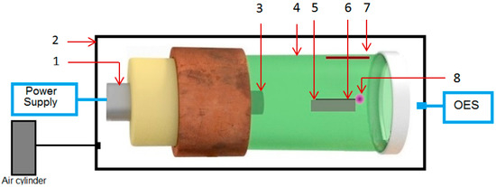 Design of the experimental setup: 1—commercial magnetron; 2—pressure chamber; 3—magnetron antenna; 4—waveguide cavity; 5—ceramic support; 6—metallic wire; 7—deposition substrate; 8—plasma.