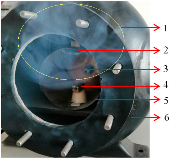 Generation of tungsten oxide nanoparticles during microwave discharge process: 1—tungsten oxide cloud; 2—metallic support; 3—magnetron antenna; 4—metallic wire; 5—TM011 waveguide; 6—pressure chamber.