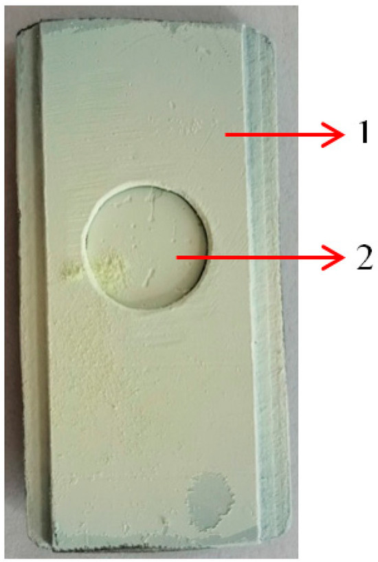 The tungsten oxide layer with 21 μm thickness deposited on the surface of the CFRP sample: 1—metallic support; 2—CFRP sample after deposition process.