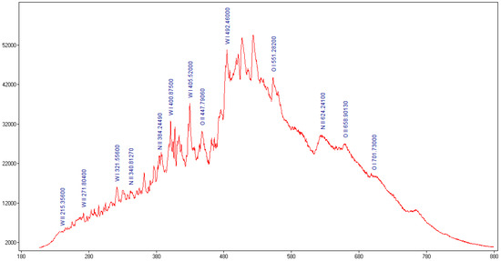 Using Span V.1.7 Spectrum Analyzer software [28], the recorded optical emission spectrum of the microwave discharge was analyzed, and the result is displayed in Figure 6. One can observe that during the interaction between microwaves and the tungsten wire, a plasma is generated, which emitted spectral lines in UV-VIS-NIR domain. These spectral lines correspond, in agreement with the spectral lines from the NIST database, to metallic excited atoms and ions, namely WI and WII, and gas excited atoms and ions, namely OI, OII, NI and NII [29].