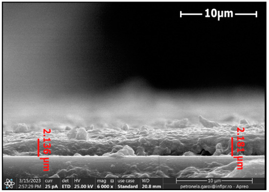 The energetic domain presented on the X-axis of the Boltzmann plot corresponded with the frequency of the spectral lines selected for determining the electronic excitation temperature of the excited neutral atom species, where for , I—intensity of the spectral lines; λ—wavelength of the spectral lines; A—transition probability; g—the statistical weight of the upper energy level; excitation energy (eV)—energy level of upper state. To determine the dimension of the tungsten oxide particles and thicknesses of the layers of the tungsten oxide deposited on the surface of the CFRP samples, we used scanning electron microscopy (SEM) investigations. Figure 8 and Figure 9 display the cross sections of the tungsten oxide thin films deposited on the CFRP samples. Figure 8 was scanned at 6000× magnification, and Figure 9 was scanned at 800× magnification.