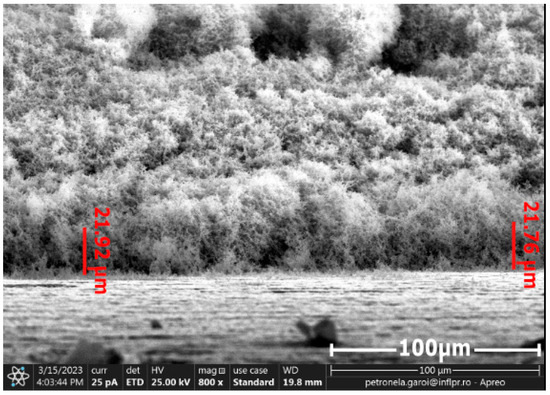 For the first CFRP sample exposed for 10 s to microwave discharge, a tungsten oxide thin film of 2 µm thickness was deposited (Figure 8), and for the second CFRP sample (Figure 9) exposed to 50 s of microwave discharge, a tungsten oxide thin film of 21 µm thickness was deposited. Figure 10 and Figure 11 display the SEM images for the two samples. Figure 10a and Figure 11a were scanned at 5000×, and Figure 10b and Figure 11b were scanned at 100,000×.