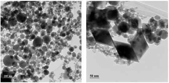The bright-field TEM (BFTEM) images acquired from the thickest WO3 film deposited are presented in Figure 12. Various shapes of nanoparticles are identified, from spherical (majority) to polyhedral and rhombohedral, with a bimodal distribution, starting from 5 nm to up to 100 nm. The nanoparticles of WO3 are single crystals and exhibit various orientations, as one can observe in Figure 13, where a high-resolution TEM image is presented.