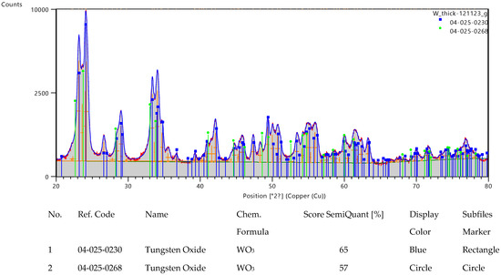 Figure 14 displays the structural analysis of the tungsten oxide diffraction patterns performed with HighScore Plus 4.1 software from Panalytical (Almelo, the Netherlands). Very good matches for the acquired patterns both in terms of peak positions and relative intensities were found for WO3 monoclinic (reference code 04-025-0230, matching score of 65 and semi-quantitative fraction of 68%, blue markers) and WO3 tetragonal (reference code 04-025-0268, matching score of 57 and semi-quantitative fraction of 32%, green markers). The XRD patterns acquired from the two WO3 samples are displayed in Figure 15. One can note that the patterns corresponding to the thicker film are more intense. However, the peak positions and relative intensities are very similar, indicative of the same crystalline structure.