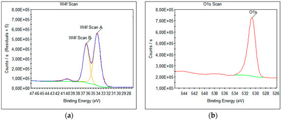 The analyzed survey XPS scans and high-resolution spectra showed the presence of W4f (Figure 16a) and O1s (Figure 16b) from WO3. The same chemical states of W4f, namely W4f7/2 (scan A) and W4f5/2 (scan B), and O1s were identified by high-resolution XPS (HR-XPS) scans.