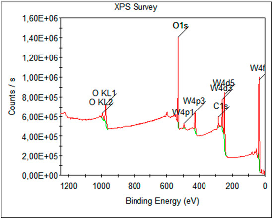 The general spectrum (survey XPS) of WO3 is shown in Figure 17, where peaks corresponding to C 1s, O 1s, W 4p, W4d and W4f were identified for the investigated sample. The presence of photoelectron signals from WO3 and carbon contamination at the binding energy value of 284.8 eV were observed. It must be said that no other metallic elements were identified.