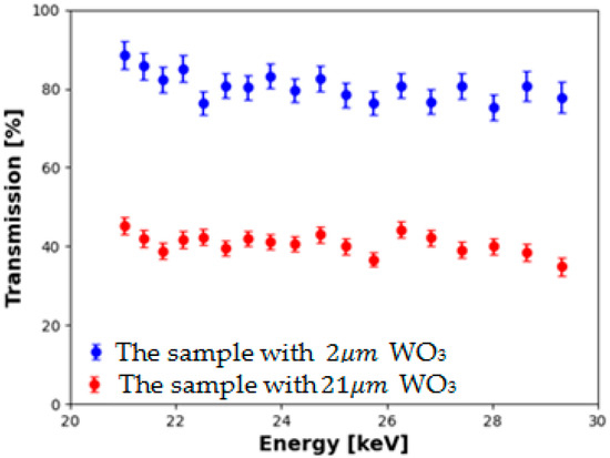 X-ray transmission vs. photons energy. Red and blue symbols correspond to samples having 2 µm and 21 µm thick tungsten oxide layers, respectively.