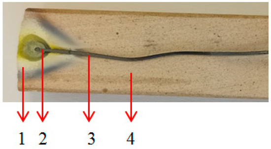 Image of the tungsten wire after plasma initiation process: 1—WO3 oxide; 2—tip of the wire; 3—unaffected tungsten wire; 4—ceramic support.