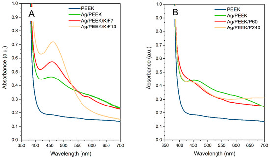 The UV-Vis spectra of the chosen samples are shown in Figure 6. Since the controls did not show optical activity, all samples that contained silver nanoparticles exhibited an optical absorption of about 450 nm. Similar trends were reported by Zeng et al. in their work on the silver–aromatic polymer composite AgNPs/PS (polystyrene) and AgNPs/AP (acrylonitrile-polystyrene), where the absorption band was 450–460 nm [35]. As can be seen in Figure 6A, composites irradiated with the KrF laser show a decreasing trend of absorbance. The peaks became narrower and more distinct with increasing laser fluence. This phenomenon can be explained by differences in the behaviour of the nanoparticles. In the case of Ag/PEEK, the silver nanoparticles appeared as a continuous layer. The layer of silver nanostructures that created it is known to have a specific absorption spectrum depending on its thickness or the conditions of preparation [36,37]. With increasing laser fluence, the nanoparticles became more separated (see Figure 2) such that their optical response was close to that of colloid nanoparticles. The results of the plasma-treated samples show the opposite trend of optical absorbance. After modification for 60 s, the concentration of silver dramatically decreased, which was reflected in a non-committal peak at 445 nm. Nonetheless, prolonged plasma treatment did not produce any dramatic changes.