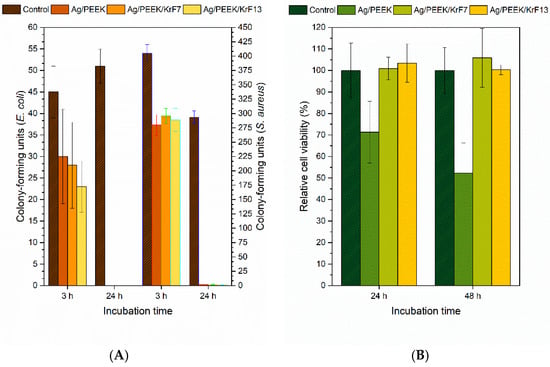 Results of biological tests showing (A) data from drop plate tests performed against Escherichia coli (left Y-axis) and Staphylococcus aureus (right Y-axis) after 3 and 24 h of incubation, expressed as the number of CFU, and (B) non-cytotoxic effects of Ag/PEEK/KrF7 and Ag/PEEK/KrF13 samples on primary lung fibroblasts cultivated for 24 and 48 h, expressed as relative cell viability (%).