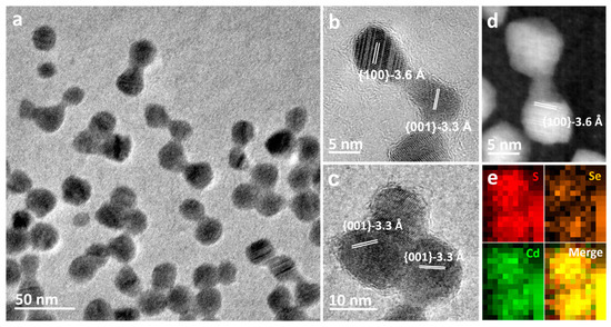 Figure 2 displays bright-field electron micrographs of a small area of nanocrystals after electron beam irradiation at 300 kV. Further electron beam irradiation led to the formation of single, fully crystalline new particles, along with a significant contraction in the sizes of aggregates formed due to coalescence, as shown in Figure 2a. Sintering was observed to occur only between particles with narrow gaps of approximately 1–2 nm. Even after extended electron beam exposure, sintering remained confined to a small region, typically involving only two or three adjacent nanocrystals. The increased spacing between sintered particles over time hindered continuous sintering, confirming the limited mobility of particles. The 3.6 Å and 3.3 Å spacing fringes in Figure 2b,c correspond to the {100} and {001} lattice fringes of CdSeS, respectively. High-resolution HAADF-STEM image of the dimer in Figure 2d confirms the lattice fringes of CdSeS{100} planes are clearly visible. The EDX image of the dimer in Figure 2e shows a uniform distribution of all three elements, indicating that the dimeric structure of CdSe/CdS nanocrystals eventually converts to stoichiometric CdSeS.