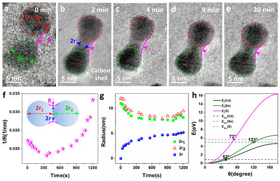 (a–e) A sequence of in situ TEM heating images displaying sintering of two CdSe/CdS nanocrystals under electron beam irradiation at room temperature. The arrow in the second frame shows a carbon shell presented on the surface of the dimer. (f,g) Variation of parameters, including neck curvature (), radius of individual particles ( and ) and the neck () as a function of electron beam irradiation time, a model established for the newly formed dimer with some parameters defined. The illustration shows the model established for the newly formed dimer, which defines some parameters. (h) Transfer energy () of Cd (black), Se (green), and S (pink) from 300 keV electrons as a function of the scattering angle . Horizontal dashed lines show the surface binding energy of Cd (black), Se (green), and S (pink).