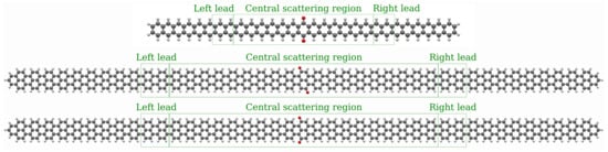 To represent the devices embedded between semi-infinite leads, molecular clusters were built out of repeated GNR cells. The center around the quinone structure and the hydrogen atoms on the edges were structurally optimized. Structural optimization of the hydrogens on the edges and of the central region were performed through the libxc implementation of the optPBE-vdW functional [47,48,49].