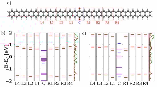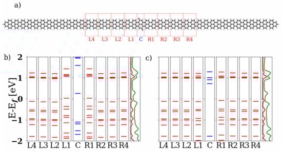 (a) Structure and partitioning of the trans 5-AGNR quinone system is depicted above. The carbon atoms are drawn in black, the hydrogen atoms in white and the oxygen atoms in red. The parts that were selected for the central scattering region (C) and the left (L1–L4) and right (R1–R4) cells are marked with red boxes in the image. Below: (b) The local energy spectrum of the quinone structure is shown and (c) the local energy spectrum of the hydroquinone structure. The local states are labeled with the corresponding sections. The rightmost sections show the PDOS for the leads in red and the complete cluster in green.