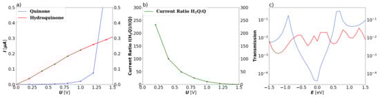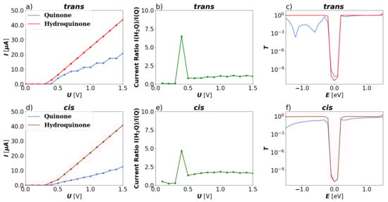 In contrast to the 2-ZGNR systems, the qualitative difference in conductance between the quinone and hydroquinone form remains the same at all investigated biases. For the trans configured 5-AGNR systems, throughout the bias window that is examined, the hydroquinones exhibit a higher total current than the quinones, as seen in Figure 7. The hydroquinone systems become conducting at a bias of 0.4 V and the quinone at 0.5 V. This creates a peak in the ratio between the currents at 0.4 V as seen in Figure 8. At higher biases the ratio fluctuates between 2–3. After crossing their respective thresholds both systems exhibit a linear increase in current. This is also reflected in the transmission functions shown in panels (c) and (f) of the same figure. In all cases there is a gap in the transmission function around the Fermi level with sharp increase in either direction. The transmission function of the quinone forms after the increase remain under those of the hydroquinone forms and show considerably lower levels at negative energies. There appears to be no influence of quantum interference.