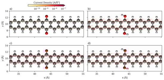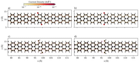 - Shao, J.; Pohl, V.; Marsoner Steinkasserer, L.E.; Paulus, B.; Tremblay, J.C. Electronic Current Mapping of Transport through Defective Zigzag Graphene Nanoribbons. J. Phys. Chem. C 2020, 124, 23479–23489. [Google Scholar] [CrossRef]