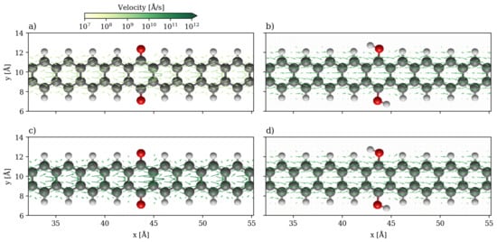 In this work, we examine the electronic and transport properties of both an example for a ZGNR and an AGNR, functionalized with a quinone group or two carbonyl groups respectively. For simplicity and consistency in the following text, the latter shall be referred to as 5-AGNR systems in quinone or hydroquinone form. The electronic structure is investigated through methods of density functional theory (DFT) and the resulting Hamiltonian matrices are extracted. These are used in the calculation of the transport properties through nonequilibrium Green’s function (NEGF) and the Landauer formalism. A procedure first proposed by Evers and co-workers enables the representation of the local current flow [36,37,38,39,40,41]. These local currents provide invaluable mechanistic information about the charge transport mechanism under non-equilibrium conditions and have allowed establishing structure-function relationships in other graphene-based systems [16,42,43,44]. An effect that is related but not investigated here is the pH dependent shift of the drain-source current gate potential curve that is observed in ZGNRs [45].