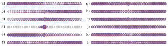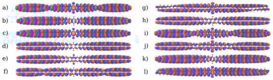 Frontier molecular orbitals of the trans 5-AGNR systems. (a–f): Orbitals of the quinone form from LUMO+2 to HOMO-2. (g–l): Orbitals for the hydroquinone form from LUMO+2 to HOMO-2. The phases of the orbitals are depicted in red and blue.