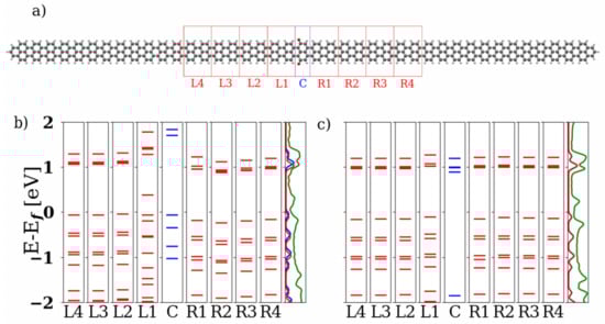 (a) Structure and partitioning of the cis 5-AGNR quinone system is depicted above. The carbon atoms are drawn in black, the hydrogen atoms in white and the oxygen atoms in red. The parts that were selected for the central scattering region (C) and the left (L1–L4) and right (R1–R4) cells are marked with red boxes in the image. Below: (b) The local energy spectrum of the quinone structure is shown and (c) the local energy spectrum of the hydroquinone structure. The local states are labeled with the corresponding sections. The rightmost sections show the PDOS for the leads in blue (left lead) and red (right lead) and the complete cluster in green.