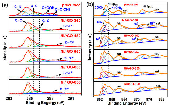 The XPS survey of the precursor and Ni/rGO at different calcination temperatures is shown in Figure S4a, which indicates that Ni, O, and C are found in all of the samples and that there is N in the precursor but not in all Ni/rGO samples, indicating that N does not participate in the coordination after calcining. The full spectrum was corrected by C 1s binding energy (284.6 eV). The fitted O 1s spectra of each sample are presented in Figure S4b. The peak at 530.0 eV in the precursor corresponded to Ni–OOC, consistent with the fitting results of Ni 2p and C 1s, indicating that there was indeed a Ni-based coordination precursor in the precursor. The peak at a binding energy = 529.25 eV of the Ni/rGO was assigned to the lattice oxygen of the NiO lattice [39]. However, there is no diffraction peak of the corresponding oxidized species in the XRD patterns (Figure 3d), because there are relatively few oxidized species, which cannot be observed by XRD. The peak at ~530.90 eV of all samples was considered as the signal of the Ni–O–C bond [40], which indicated that the surface oxygen of the rGO matrix was closely associated with nickel species. The Ni/rGO samples all contained –OH(~532.75 eV) [41], which was attributed to adsorbed water, and Ni–OH bonds [42] (532.25~531.75 eV) in the fitted peaks. However, the Ni–OH bond disappeared in Ni/rGO-800. This may be because the calcination temperature is so high that the adsorbed molecules on the Ni surface are removed. The C 1s spectra in Figure 4a showed that the peaks of the precursor at 284.14, 284.78, 285.72, 286.43, 287.40, and 288.38 eV were attributed to C–Ni, C=C, C–C C–O, –C=OOH and –COONi coordination bonds, respectively [22,43,44]. With an increase in calcination temperature, the peak intensity related to oxygen functional groups in Ni/rGO decreased significantly and finally gradually disappeared, indicating that the oxygen functional groups of GO were effectively removed after heat treatment. Meanwhile, the C=C peak shifted to the high-binding-energy direction and showed a π–π* peak belonging to graphene at 288.25 eV [45]. Two distinct splitting peaks of Ni 2p1/2 and Ni 2p3/2 are displayed in Figure 4b owing to spin–orbit coupling. Similarly, the corresponding satellite peaks were acquired as a result of the multiple splitting of spin–orbit energy levels. In Figure 4b, it is evident that the precursor’s Ni comprised a Ni complex (–COONi, 854.4 eV) [46] and Ni(OH)2 (856.0 eV). As the precursor was calcined, the characteristic peak of Ni0 (~851.95 eV) [46] and NiO (854.40 eV) began to appear in Ni/rGO-350 and the characteristic peak of –COONi gradually disappeared. In the high-resolution XPS Ni 2p spectra of the precursors and Ni/rGO catalysts, there was a negative shift in the binding energy of Ni0 and a characteristic peak of NiO that indicated the enrichment of electrons on Ni NPs. This enrichment is attributed to the charge transfer effect from rGO to metallic nickel [10], which can enhance the electron density of the active sites on the metal catalyst, thus strengthening the interaction between the metal surface and the reactants [47], promoting the oxygen reduction reaction.