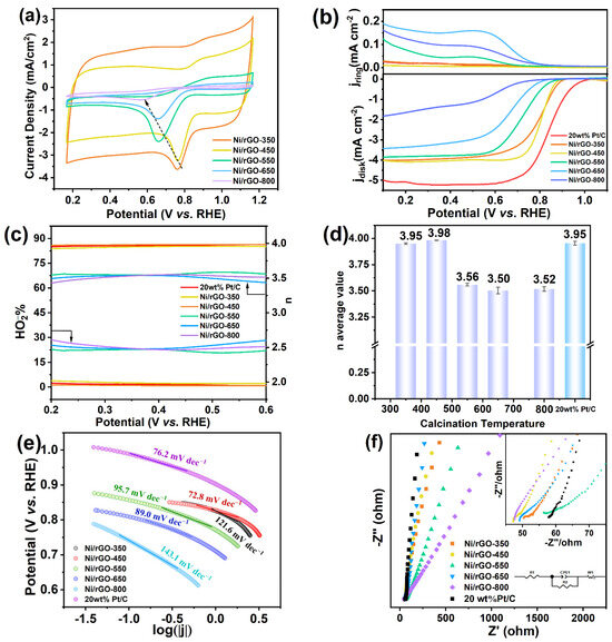 (a) CV curves of the Ni/rGO catalysts in O2-saturated 0.1 mol L−1 KOH at a scan rate of 50 mV s−1, (b) LSV curves, (c) H2O2 selectivity, and (d) electron transfer numbers of different as−fabricated Ni/rGO catalysts; (e) Tafel plots and (f) Nyquist plots of different fabricated Ni/rGO catalysts.