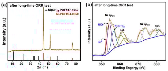 The durability of the Ni/rGO-450 and 20 wt% Pt/C catalysts was evaluated by accelerated stress testing (AST) (Figure 6c,d). After 5000 cycles of CV, the E1/2 of Ni/rGO-450 was negatively shifted by only 47 mV (Figure 6d) which is smaller than that of Pt/C (74 mV, Figure 6c), indicating excellent electrochemical durability. Furthermore, the reason for the high ORR stability and durability of Ni/rGO-450 was explored by analyzing the phase and elemental valence state of Ni/rGO-450 before and after the ORR stability test. As illustrated by Figure 7a, the metallic Ni phase retained its characteristic diffraction peak in Ni/rGO following the long-term ORR test, and no NiO diffraction peak was detected. In Figure 7b, Ni still exhibited metal nickel and Ni2+ valence states. All these findings demonstrate that Ni/rGO-450 retains a stable structure after a prolonged ORR test. The outstanding long-term stability and durability of Ni/rGO-450 as an electrocatalyst for ORR resulted from integrating Ni atoms onto the rGO matrix (Ni/rGO), alleviating the loss of metallic species during the ORR [16]. As shown in Table S1, the ORR efficacy of the Ni/rGO electrocatalyst synthesized in this study surpasses that of other non-noble metal catalysts.