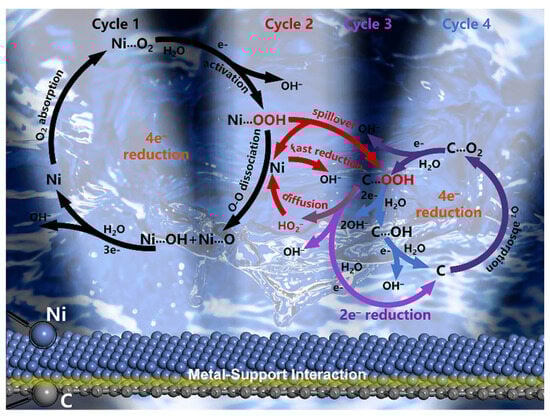 The possible ORR catalytic mechanism and pathway of the Ni/rGO electrocatalyst were proposed, as displayed in Figure 8. Here, in an alkaline environment, oxygen undergoes direct reduction to OH- (cycle 1) through a four-electron process that prevails on the nickel surface. The primary reaction equations are presented in Equations (S5)–(S8) in the Supplementary File. The ORR on graphene can be performed by 2e− (Cycle 3) or 4e− (Cycle 4) reduction, depending on the relative stability of the OOH* intermediate produced after O2 adsorption on the Ni/rGO catalyst. The loaded Ni NPs could activate its adjacent C sites [18]. Consequently, graphene is capable of reducing the chemical adsorption (Cycle 4 and Cycle 2) of ORR intermediates onto the nickel surface through the solid-phase spillover effect, allowing the continual regeneration of active sites on the Ni surface for adsorption and activation of other oxygen-containing species or O2 molecules from the KOH solution [54]. The HO2− intermediates generated on the surface of graphene by 2e− reduction can also efficiently diffuse towards the nearby Ni surface or the interface of Ni/rGO, where they can be further rapidly reduced to OH− (Cycle 2 and Cycle 3). This mechanism acts as the pseudo-four-electron path on the RRDE, as the peroxide is rapidly reduced before detection by the ring electrode [55]. This method is extensively utilized in carbon-based electrocatalytic material systems to enhance four-electron pathway reactions on the surface of non-noble transition metals [56].
