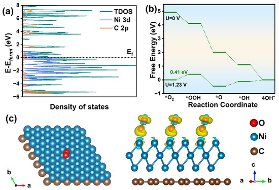 Furthermore, to ascertain the rate-determining step (RDS) and their limiting reaction barrier during the ORR process, the free energies of each step in Ni/rGO models are calculated at two states, namely zero electrode potential (U = 0 V) and equilibrium potential (U = 1.23 V), as illustrated in Figure 9b. For analysis, oxygenated intermediates including *OOH, *O, and *OH species are considered, where * denotes the adsorption site. For the Ni/rGO, the first ORR electron transfer step (from O2 to *OOH) is regarded as the RDS, with an RDS energy barrier of 0.41 eV, which is much lower than that for Pt(111) whose overpotential is about 0.45 V (theoretical value) [58] or 0.44 V (experimental value) [59,60], indicating faster kinetics. Moreover, charge density difference analysis is conducted to investigate the electron transfer and structural interactions. As shown in Figure S7a, graphene with a π-electron system formed an interface with metallic nickel, where the difference in charge density illustrated electron transfer from graphene to Ni and subsequent accumulation at the interface. Concurrently, the structural model with adsorbed *O2 intermediate displays electron transfer from the Ni atoms to the adsorbed O2 molecules (Figure 9c), which contributes to reducing the RDS energy barrier.
