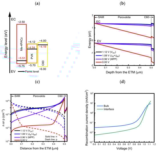 - Minemoto, T.; Murata, M. Impact of work function of back contact of perovskite solar cells without hole transport material analyzed by device simulation. Curr. Appl. Phys. 2014, 14, 1428–1433. [Google Scholar] [CrossRef]