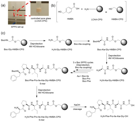 (a) Experimental set up for SPPS. Controlled pore glass (CPG) synthesis: filter syringe reactor containing LCAA-CPG beads and magnetic stirring bar. All synthesis steps (deprotection, coupling) took place in the system, with excess liquids (solvent, reagent) vacuum-drained into waste. (b) Functionalization of LCAA-CPG with HMBA linker. (c) Chemical steps in the synthesis of representative pentapeptide FPIAG on CPG.