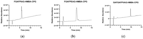 Aliphatic residues Leu, Ile and Val (L, I, V) [29], with predictably uncomplicated behavior given their bifunctional nature, were first tried at the X position of the FPXAG model peptide. FPLAG-, FPIAG- and FPVAG-HMBA-CPG were assembled as outlined above, with HBTU/DIPEA-mediated couplings (10 eq. each of Boc-amino acid and HBTU, 20 eq. DIPEA, 1 h), with final cleavage with 0.1 M NaOH/dioxane, 45 min. HPLC-MS analysis of the crude end products showed very good yields in the 94–98% range (Table 2, entries 1–3, Supplementary Materials Table S1).