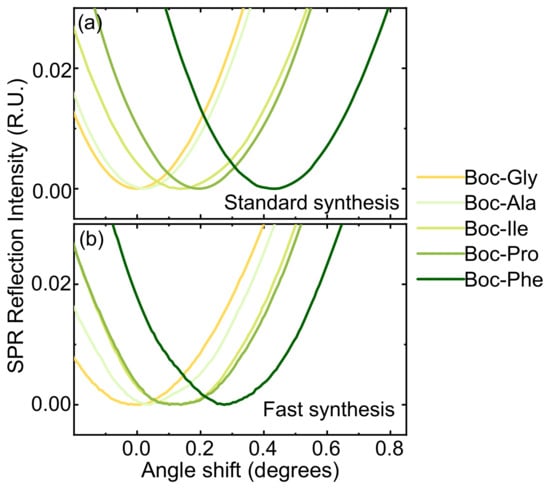 Figure 4a–c shows the SPR monitoring of flat surface functionalization and synthesis. After each step, the SPR intensity was measured as a function of incidence angle in PBS medium. The functionalization (Figure 4a) involved grafting the SiO2 surface with APTES, followed by the HMBA linker and C-terminal Boc-Gly loading. Along the synthesis, layer deposition upon amino acid addition is indicated by the monotone shift of the maximum absorption angle (Figure 4b). Changes in the angle of maximum absorption measured in this medium correspond to changes in the refractive index (Figure 4d), which can be linked to variations in surface density using the De Feijter equation [33]. Maximal and minimal angle changes correspond to Boc-Phe and to Boc-Gly/Boc-Ala, as expected from their respective refractive indexes [34]. Using the side chain length of each residue (excluding protecting groups) as an estimate of volume [35] and the De Feijter equation, we found all changes to be consistent with variations in surface density of a similar order of magnitude. The surface functionalization associated with each refractive index change is estimated to be between 1 and 2 × 1014 molecules/cm2, which is well in tune with our estimate of APTES functionalization (Table S3). Figure 4c depicts the shifts before and after deprotection, as well as the decrease in refractive index absorption caused by the deprotection process, which reduces the material at the interface.