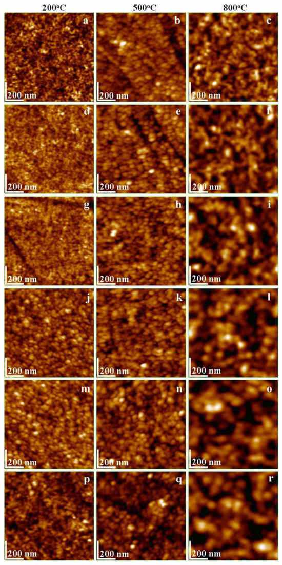 Figure 4, one can observe that nanoparticles annealed at 200 °C produce smooth, uniform, and compact layers characterized by low heights and minimal surface roughness, as indicated in