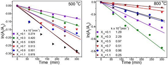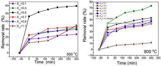Figure 6 illustrates the removal rates of the samples after 5 h of irradiation. Among samples annealed at 500 °C, NiLa