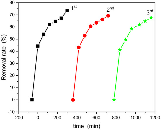 Figure 10. The sample, extracted from the solution using a magnet, underwent a washing with water and ethyl alcohol before each run, followed by an overnight drying. As could be observed from the results, the removal rate shows minimal variation, signifying the robust stability of the photocatalyst.