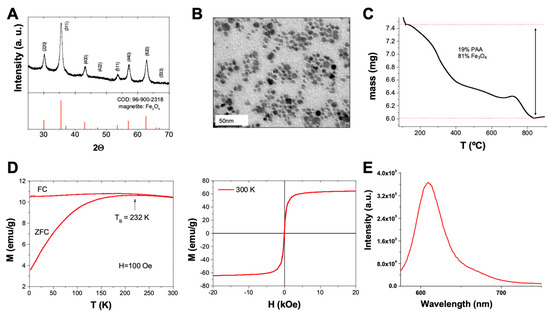 Figure 2C). The TGA results indicated that this organic component constituted approximately 19% of the total sample mass. This information highlights TGA’s capability to discern and quantify different components within the analyzed material based on their thermal behaviors. This organic layer is key to our initial design as it provides the reactive groups (carboxylic groups) for the further functionalization of the samples. Magnetic measurements from the PAA-coated NPs confirmed the superparamagnetic nature of the samples (quasi-zero coercitivity at 300 K and 0 Oe and fast magnetization as the external field increases; and blocking temperature,