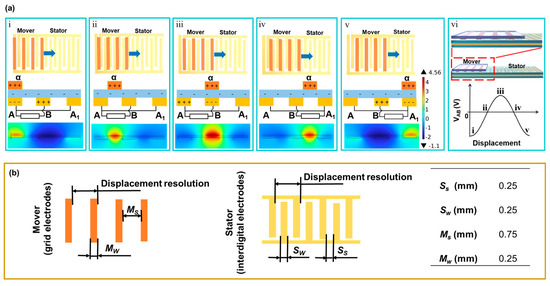 Working principle and structure of the displacement sensor: (a) working principle of the displacement sensor; (b) electrode structures of the mover and stator.