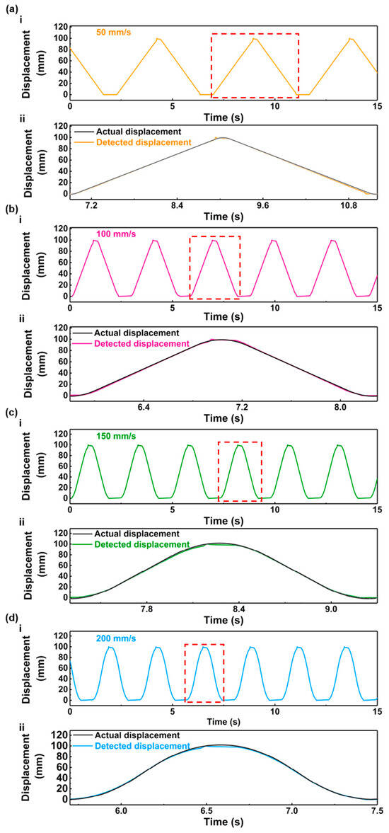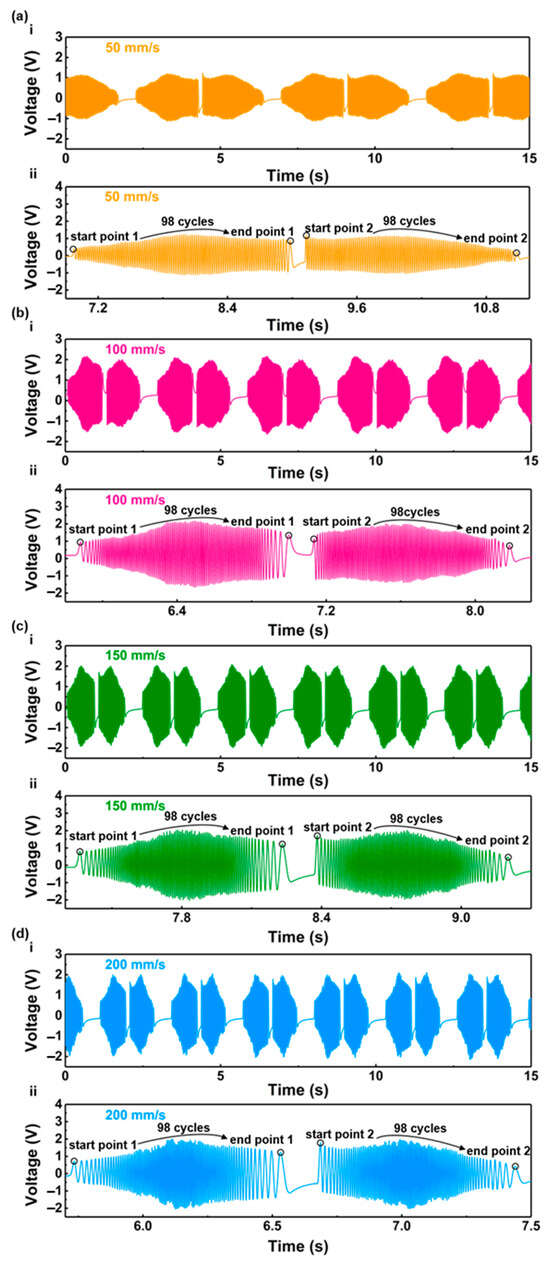 In this study, we assessed the performance of the displacement sensor in reciprocating motion. To evaluate its capabilities across various velocities, the feed velocities of the linear motors were set at 50 mm/s, 100 mm/s, 150 mm/s, and 200 mm/s, respectively. The corresponding voltage outputs of the flexible displacement sensor are depicted in Figure 5a–d. The maximum voltage outputs were recorded as 1.40 V, 2.12 V, 2.13 V, and 2.22 V at velocities of 50 mm/s, 100 mm/s, 150 mm/s, and 200 mm/s, respectively. Figure 5a(ii)–d(ii) illustrate the sensor’s output voltage during a single motion cycle at different velocities. The output voltage of the sensor increases with the increase in velocity, but the trend of the increase in the output voltage decreases when the velocity exceeds a certain value.