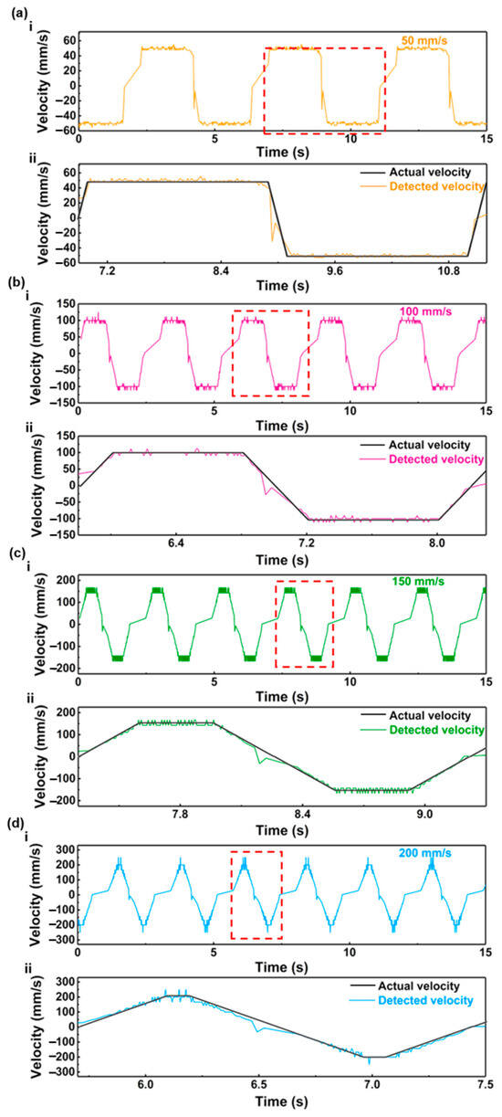 The real-time velocity of the sensor can be calculated based on the voltage output of the displacement sensor shown in Figure 5 and Equation (2). The real-time velocity curves are shown in Figure 7. Figure 7a(i)–d(i) illustrate the velocity detected by the displacement sensor. The detected velocity and the actual velocity in a single reciprocating motion of the linear motor are shown in Figure 7a(ii)–d(ii). The average velocities detected by the sensor during the constant velocity periods were 49.95 mm/s, 100.12 mm/s, 150.09 mm/s, and 200.79 mm/s for velocities of 50 mm/s, 100 mm/s, 150 mm/s, and 200 mm/s, respectively. Therefore, the errors of the velocity detections were 0.1%, 0.12%, 0.06%, and 0.40%, respectively. The velocities detected by the displacement sensor are consistent with the actual velocities of the linear motor, indicating that the sensor also has the capability for accurate velocity detection.